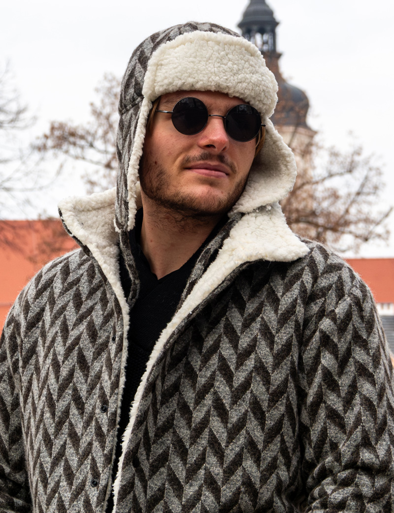 внешний слой: 70% овечья шерсть, 30% полиакрил — плотный и устойчивый к износу материал, обеспечивающий тепло и структуру;