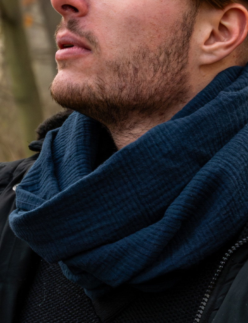 Tags: infinity scarf, cotton, muslin, blue, unisex, soft, natural fabric, breathable, all-season