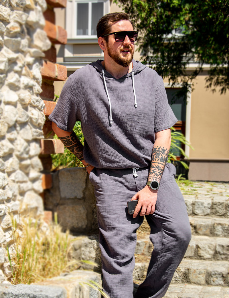 The material is easily breathable and dries very quickly, making it ideal for hot days. In a light breeze you can see that the fabric breathes. The pants are made of high quality cotton/muslin, gray color. The classic color makes them one of the most popular styles. The long pants are perfect for everyday wear, outings and vacations. These pants were made in Poland. The pants have two practical pockets and an elastic waistband. High quality material makes the pants comfortable to wear.