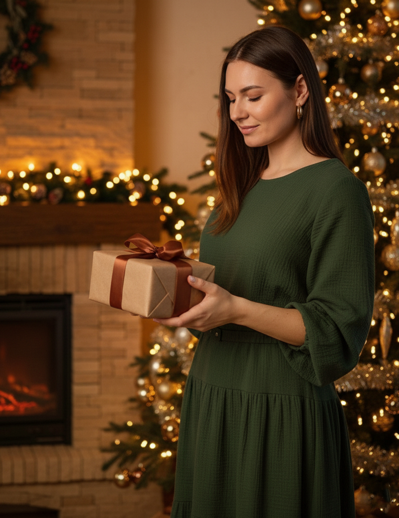 Its long cut reveals only slightly the ankles, which adds subtle charm and elegance. The loose cut and long sleeves ensure comfort and freedom of movement, while the round neckline accentuates the neck and gives the whole dress a feminine, romantic look. The dress looks perfect with an eco style belt made of eco leather.