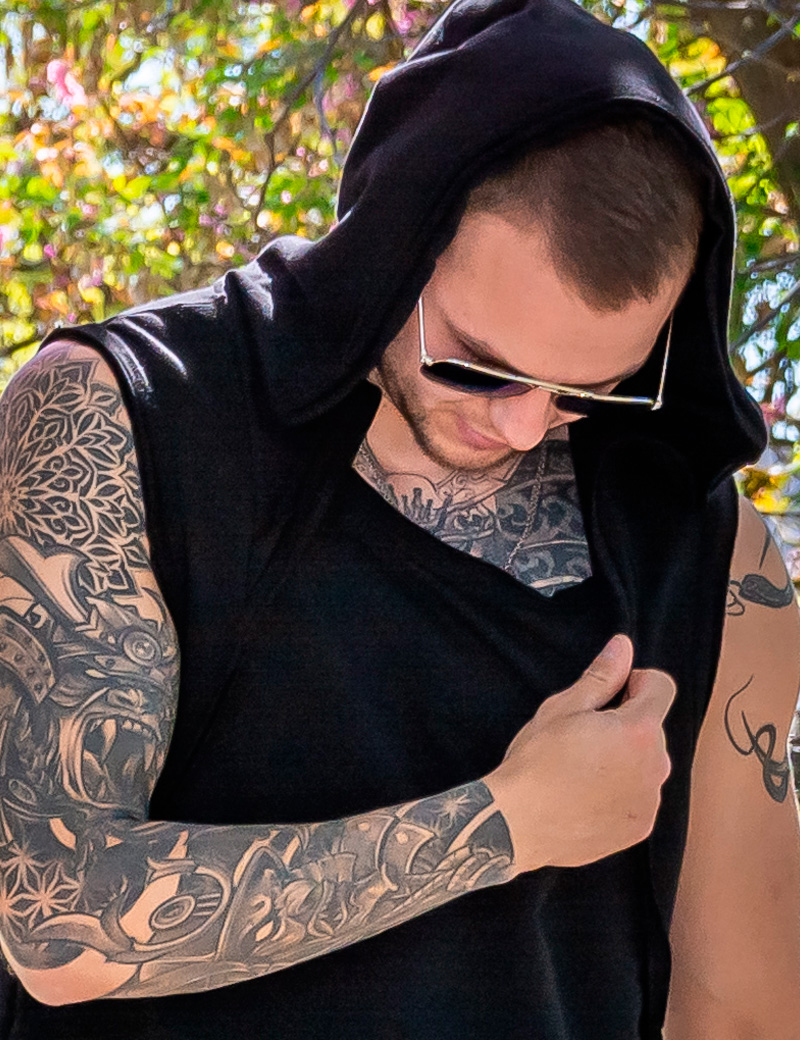Men’s black sleeveless hoodie — perfect for festivals, cyberpunk and streetwear vibes.