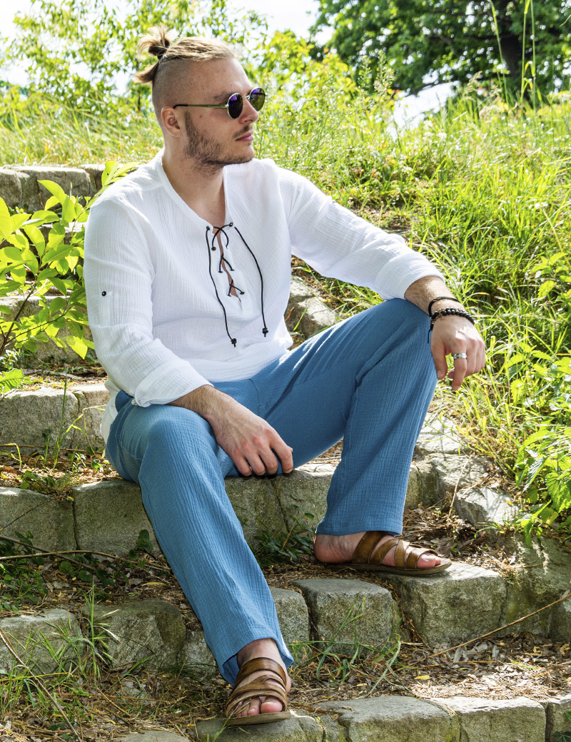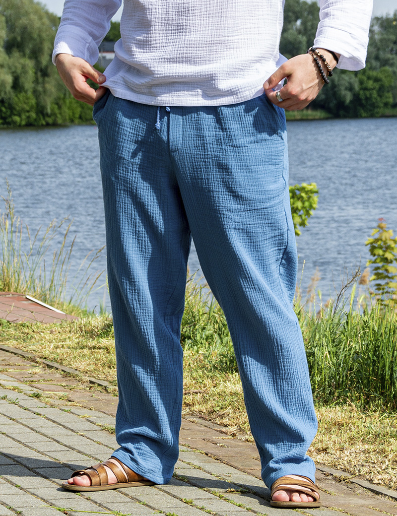 Tags: men's trousers, summer pants, cotton trousers, loose fit, relaxed fit, muslin pants, handmade clothing, slow fashion, LARIKO Studio, Faded Denim, vacation wear, travel clothing, casual trousers, ethical production, made in Poland