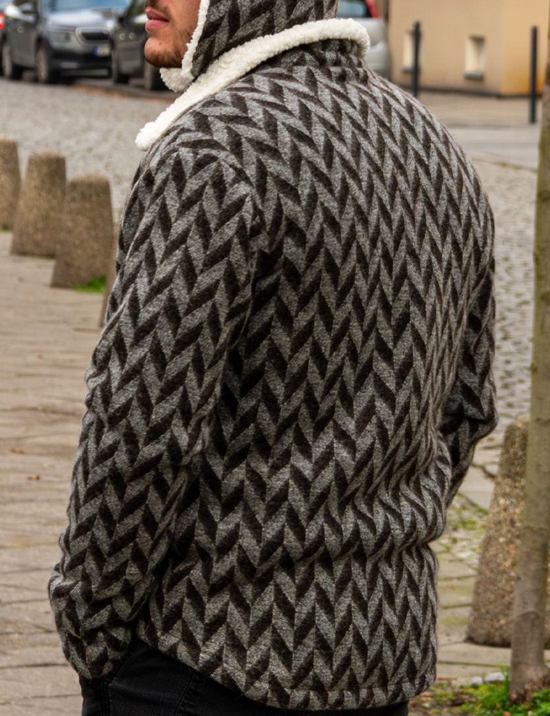 Tags: wool jacket, men’s winter coat, sherpa lining, boho men’s jacket, ethnic jacket, warm and cozy, matching hat set, handmade clothing, Lariko Studio, artisanal menswear