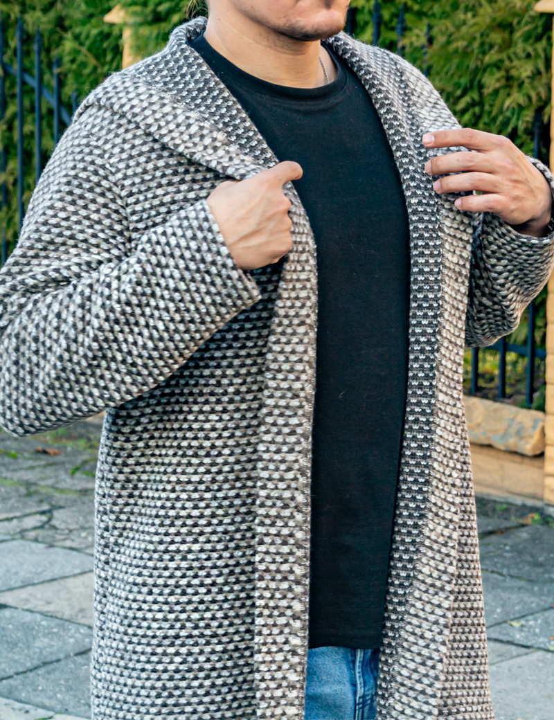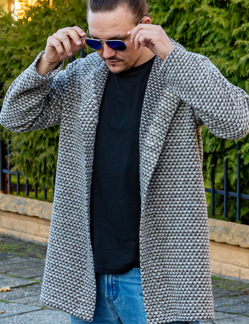 This elongated men's open-front cardigan with an oversized hood is the perfect choice for those seeking comfort, functionality, and style in the spirit of boho, ethnic, and modern nomad aesthetics.