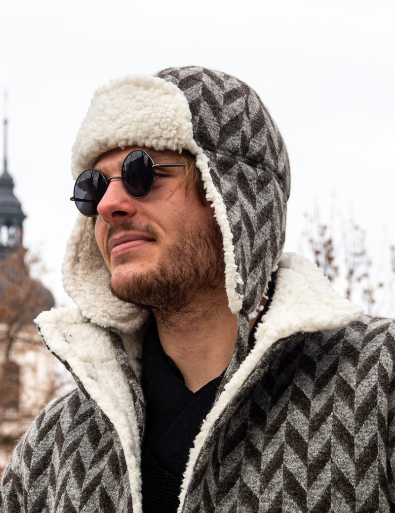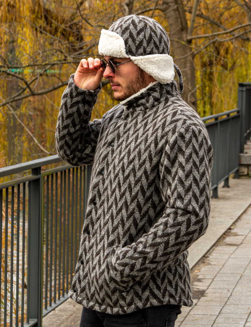 Tags: aviator hat, trapper hat, wool hat, women's hat, men's hat, unisex, handcrafted, sheep's wool, sherpa, boho style, winter, limited edition, matching jacket set, ear flaps, winter accessories, natural wool, artisan made, geometric pattern, premium wool hat