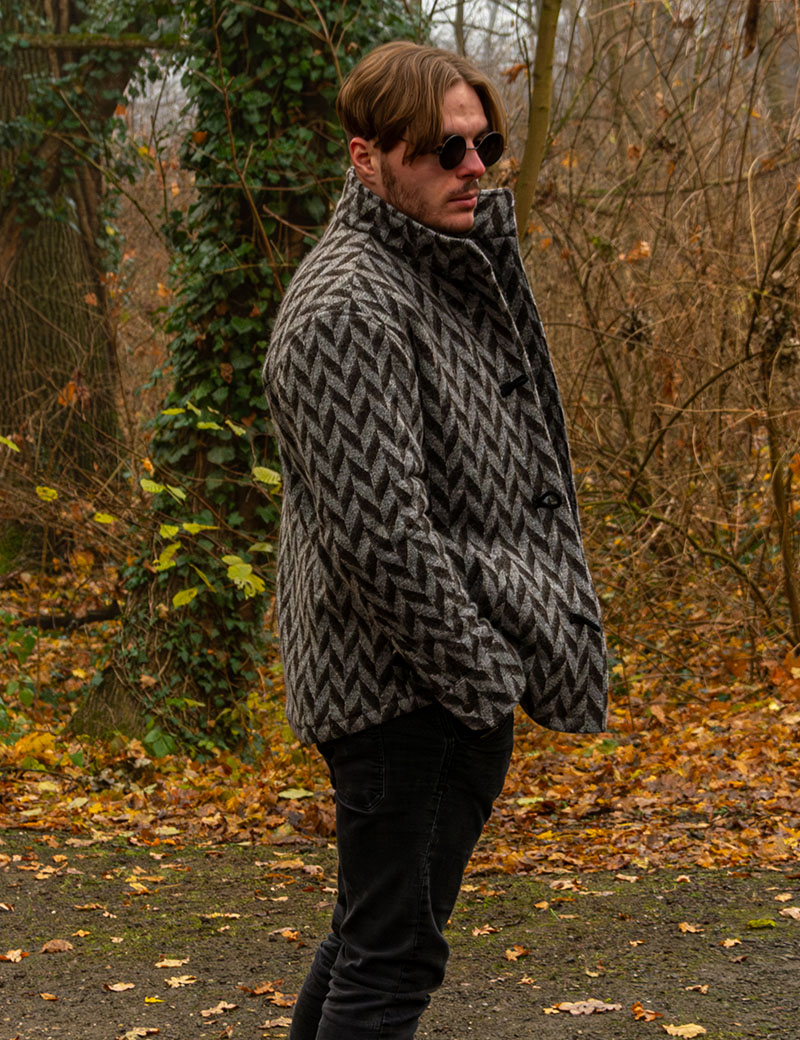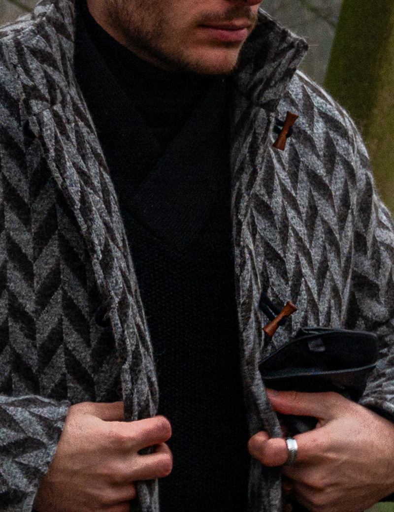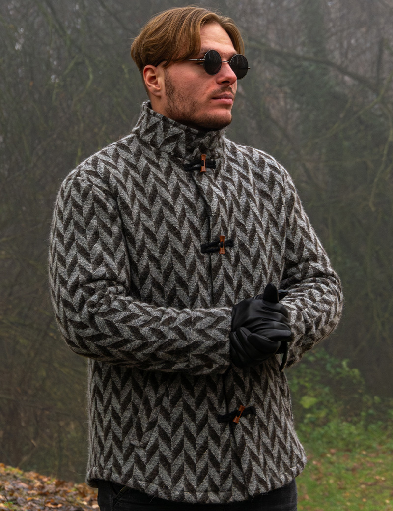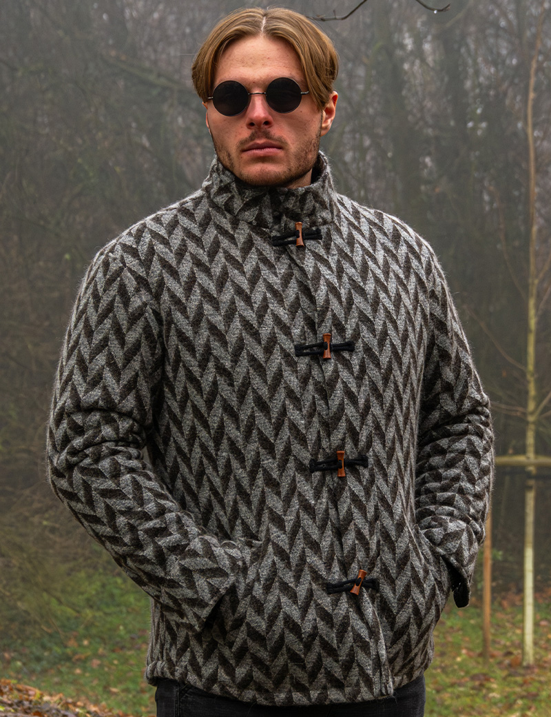 Tags: men's wool jacket, fall-winter jacket, ethnic style, rustic style, limited edition, natural wool, men's outerwear, trendy jackets 2025, wooden buttons, cable-knit jacket