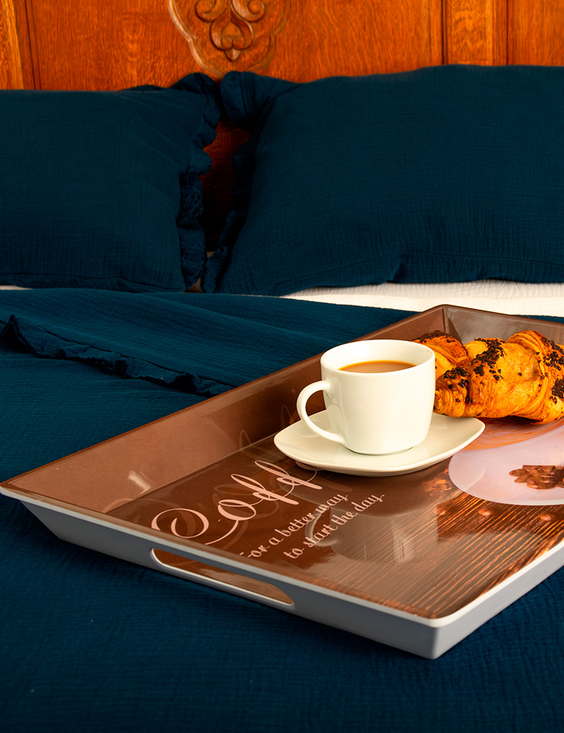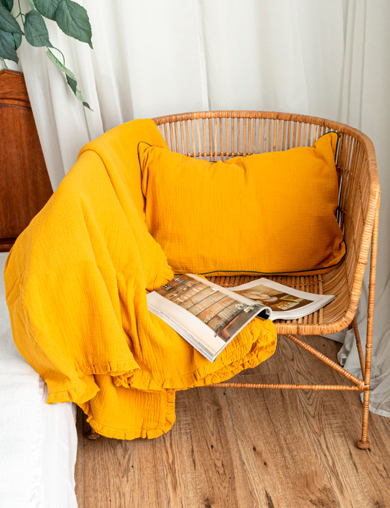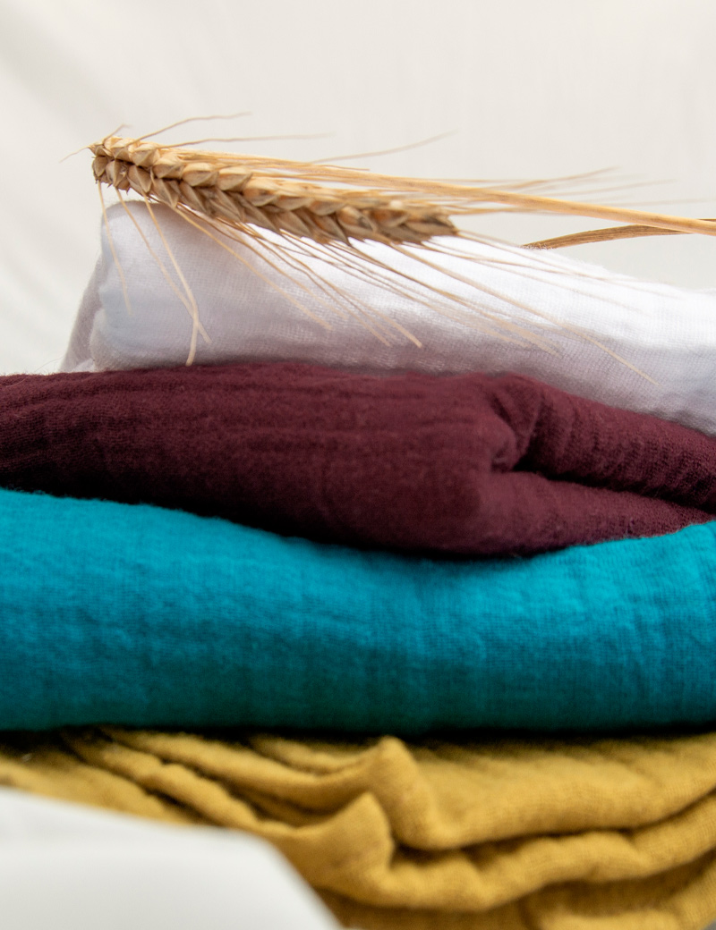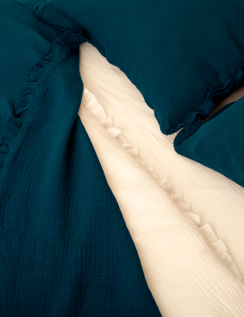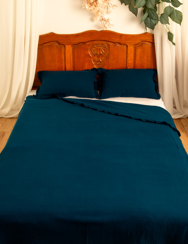 Bedding set made of soft muslin 100% cotton. The muslin keeps you cool and comfortable while sleeping. There is a fastener sewn at the bottom of the bedspread. The pillowcase has a fastener on the side.