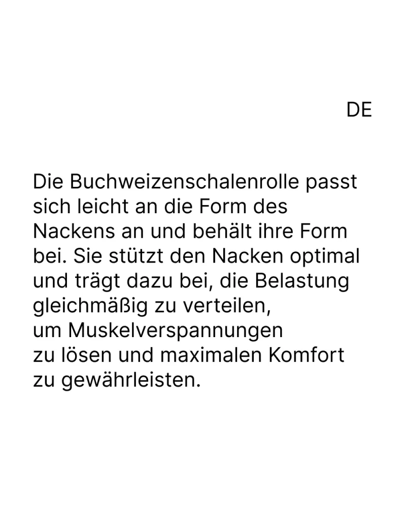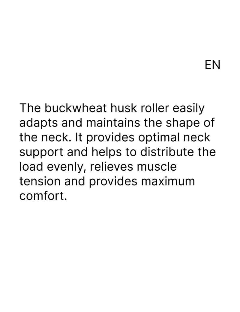 The buckwheat roller easily adapts and maintains the shape of your neck. It provides optimal support for your neck and helps to evenly distribute the load, relieves muscle tension and provides maximum comfort.