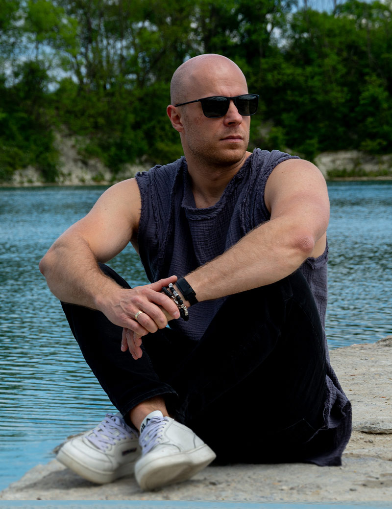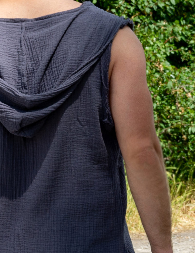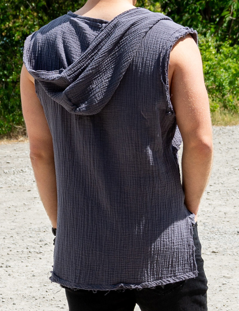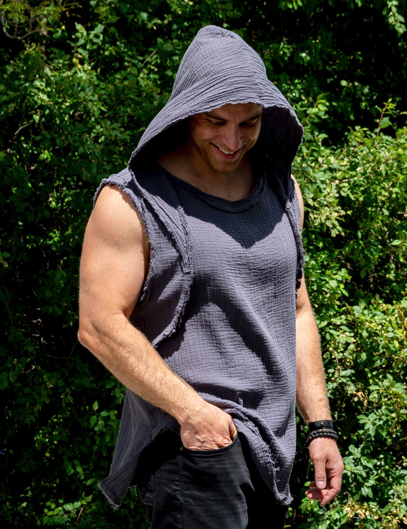 Unusual sleeveless shirt for men who like to stand out from the crowd. Sleeveless muslin shirt is very comfortable, does not constrain movements. The breathable fabric is ideal for men's summer clothing. T-shirt is perfectly combined with summer pants or jeans. Sleeveless sleeveless with a cape.