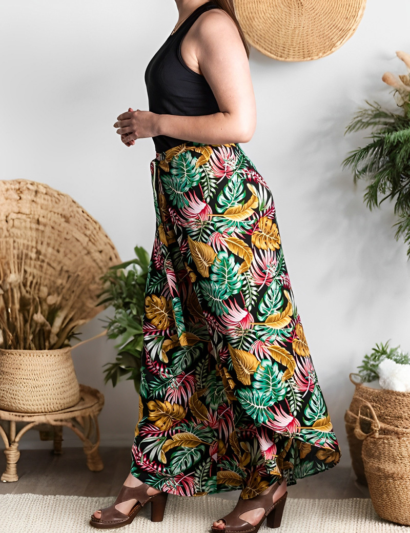 Black lightweight pants with waistband. The summer pants come in size S-L and are made from 100% lightweight viscose for breathability and softness, perfect for hot weather. The design is inspired by traditional Thai pants. These boho style pants have a loose fit, making them perfect for beach vacations at sea. The palazzo pants are suitable for boho and Arabian style looks. Colorful leaves are printed on the fabric, perfectly accentuating the summer beach mood.