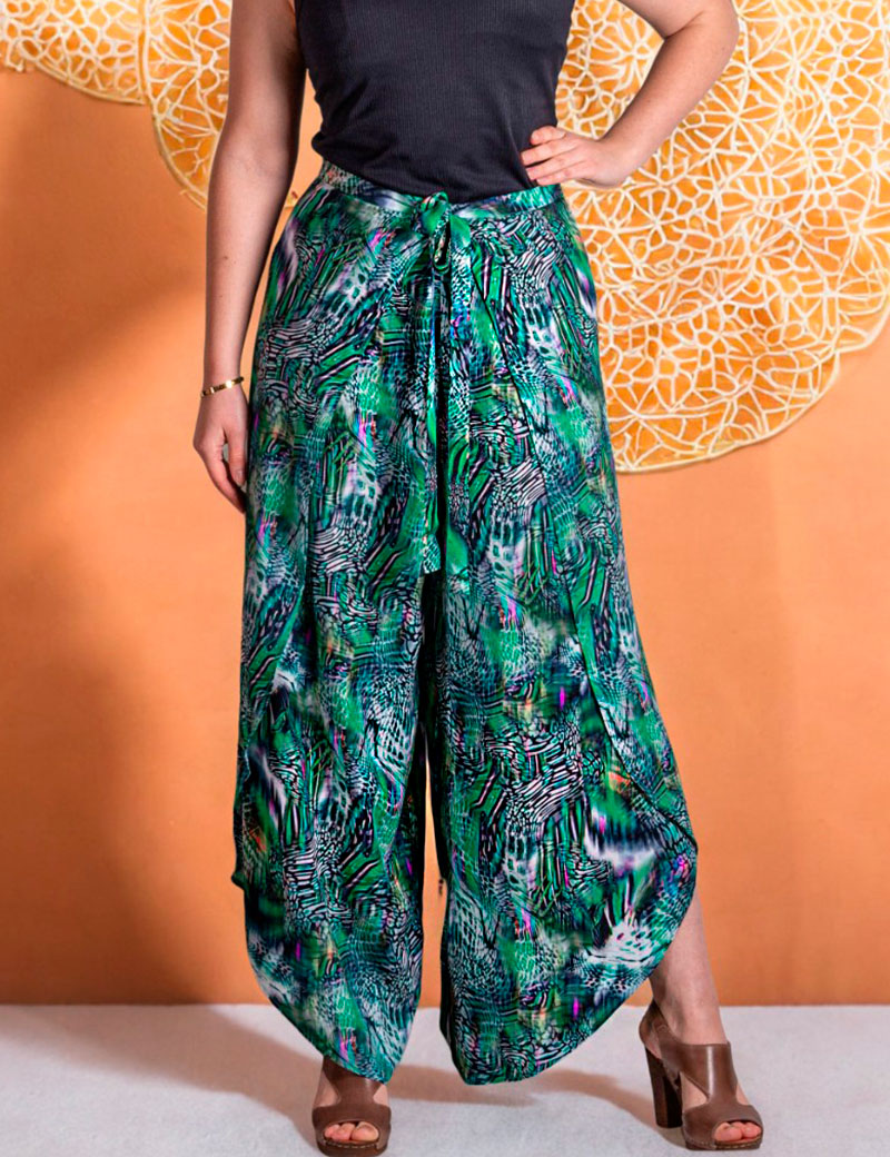 Black lightweight pants with waistband. The summer pants come in size S-L and are made from 100% lightweight viscose for breathability and softness, perfect for hot weather. The design is inspired by traditional Thai pants. These boho style pants have a loose fit, making them perfect for beach vacations at sea. The palazzo pants are suitable for boho and Arabian style looks. The fabric has a blue and green abstract pattern that looks like peacock wings.